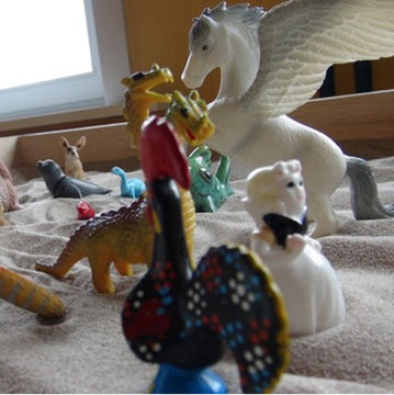 Het zandspel is een bevrijdende en inspirerende spelvorm waarbij deelnemers acteur, toeschouwer én regisseur zijn van een gemeenschappelijk traject. Kleine figuren, poppen en objecten worden neergezet in een zandbak. Waar komen we uit? Een verhaal, een beeld, een gedachte,... we zien hetzelfde maar maken onze eigen uitkomst. Al spelend ontdek je je creatievermogen.